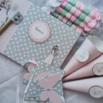 La personalización de las tapas fue con una redonda en festón, con el nombre impreso en cartulina blanca y cortado en redondo, un carrito de bebe en color gris y la fecha en la parte superior derecha del evento.