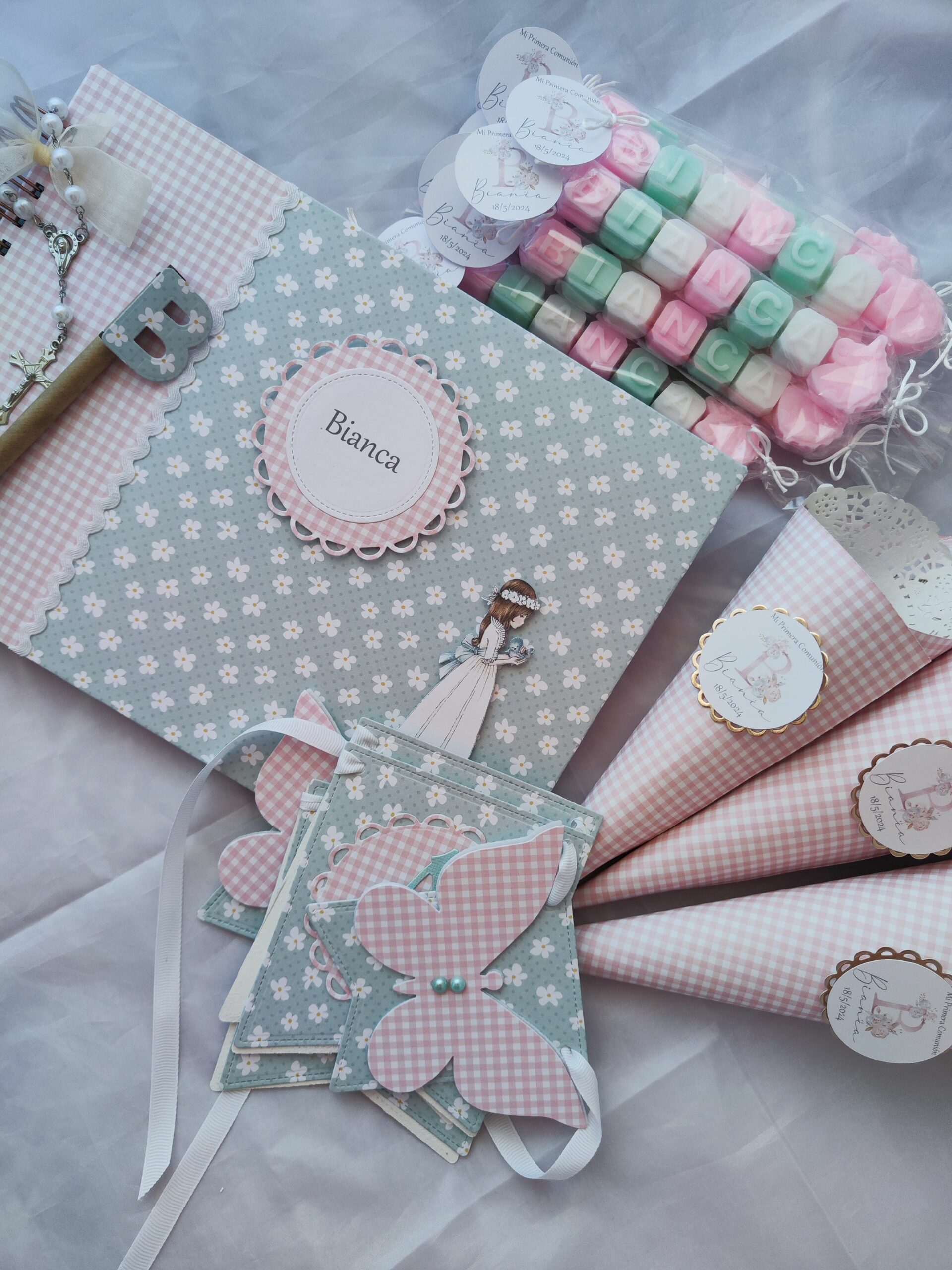 También me pidieron unos jaboncitos personalizados, combinados en rosa/blanco para las niñas y gris/blanco para los niños, con la misma etiqueta que las cajitas de chuches y con olor a gominola. Estos jaboncitos están disponibles en todos los colores, combinados como más o gusten y a elegir entre tres olores diferentes, gominola, talco y algodón de azúcar.
