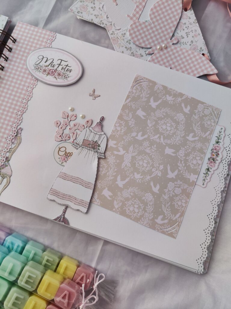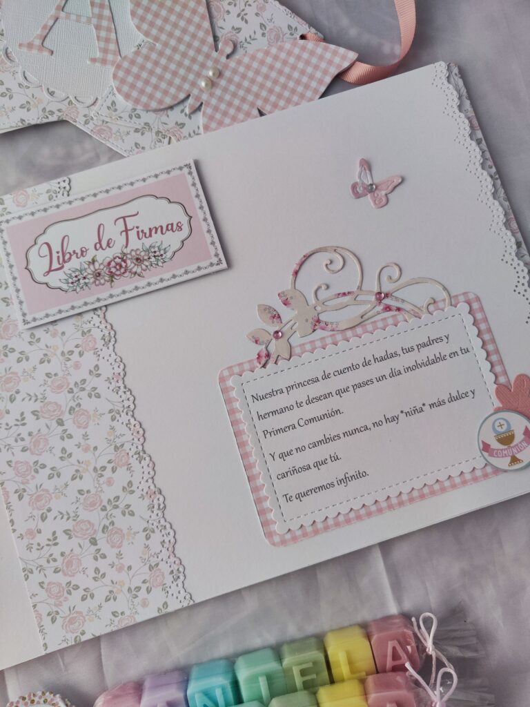 El libro incluye tres láminas decoradas por delante y por detrás, ideales para colocar las fotos más especiales y acompañarlas de palabras llenas de emoción. Además, cuenta con una página dedicada a la dedicatoria, ese espacio íntimo donde familiares o seres queridos pueden dejar un mensaje único.