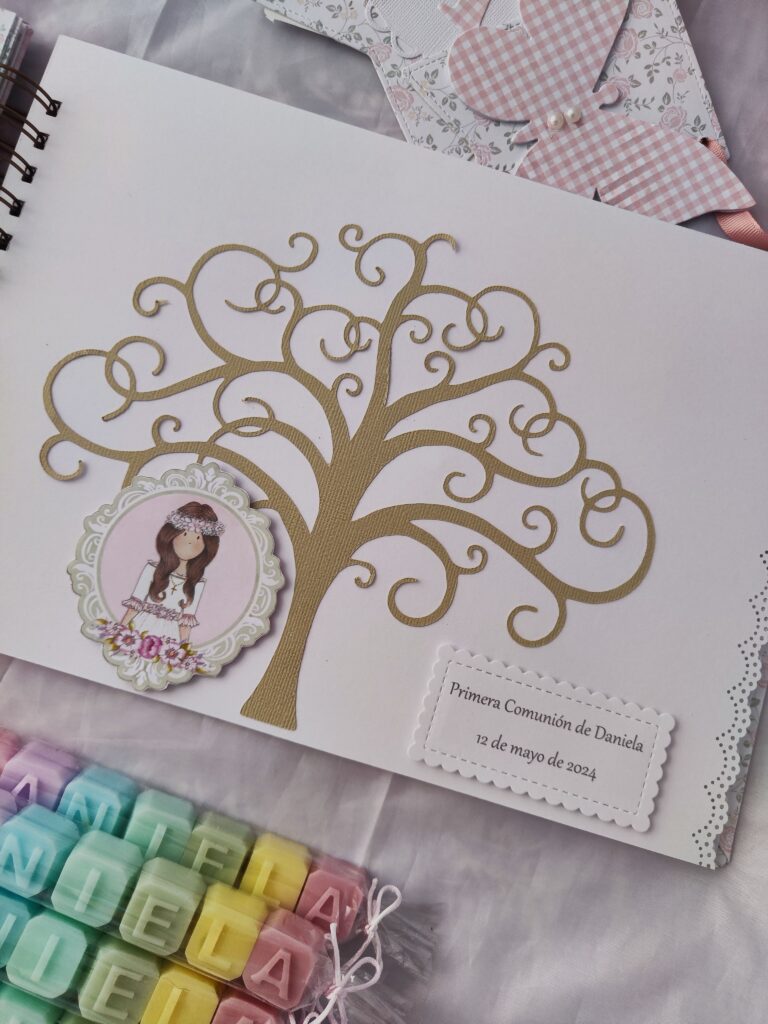 El interior del libro está pensado para que cada página tenga un significado especial. Se ha añadido una lámina dedicada al árbol de huellas, un espacio interactivo donde los invitados pueden dejar su marca utilizando tintas de colores, creando así las hojas de un árbol lleno de vida. Cada huella representa a una persona que acompañó ese día tan importante, convirtiéndose en un recuerdo visual único y muy emotivo.