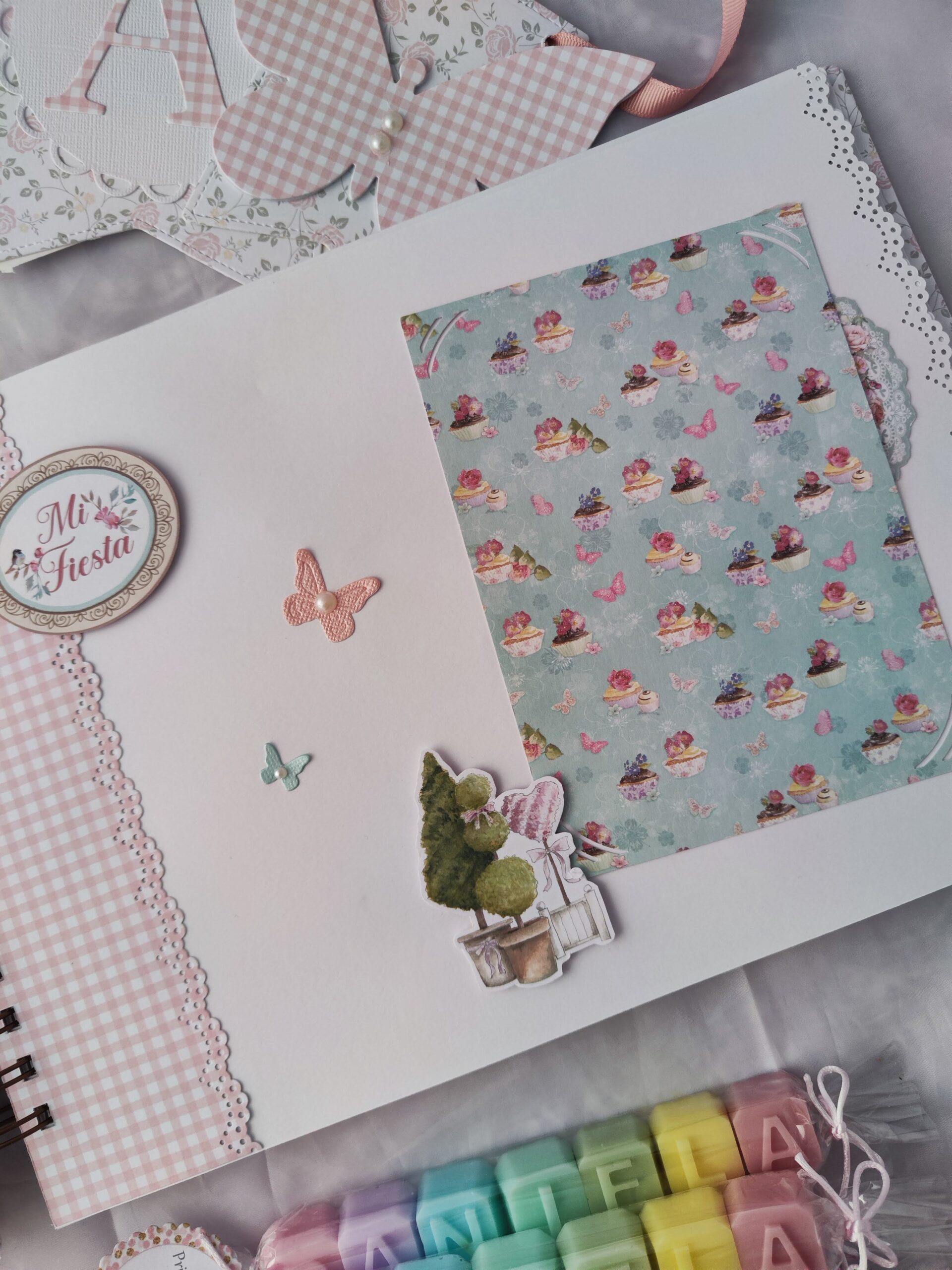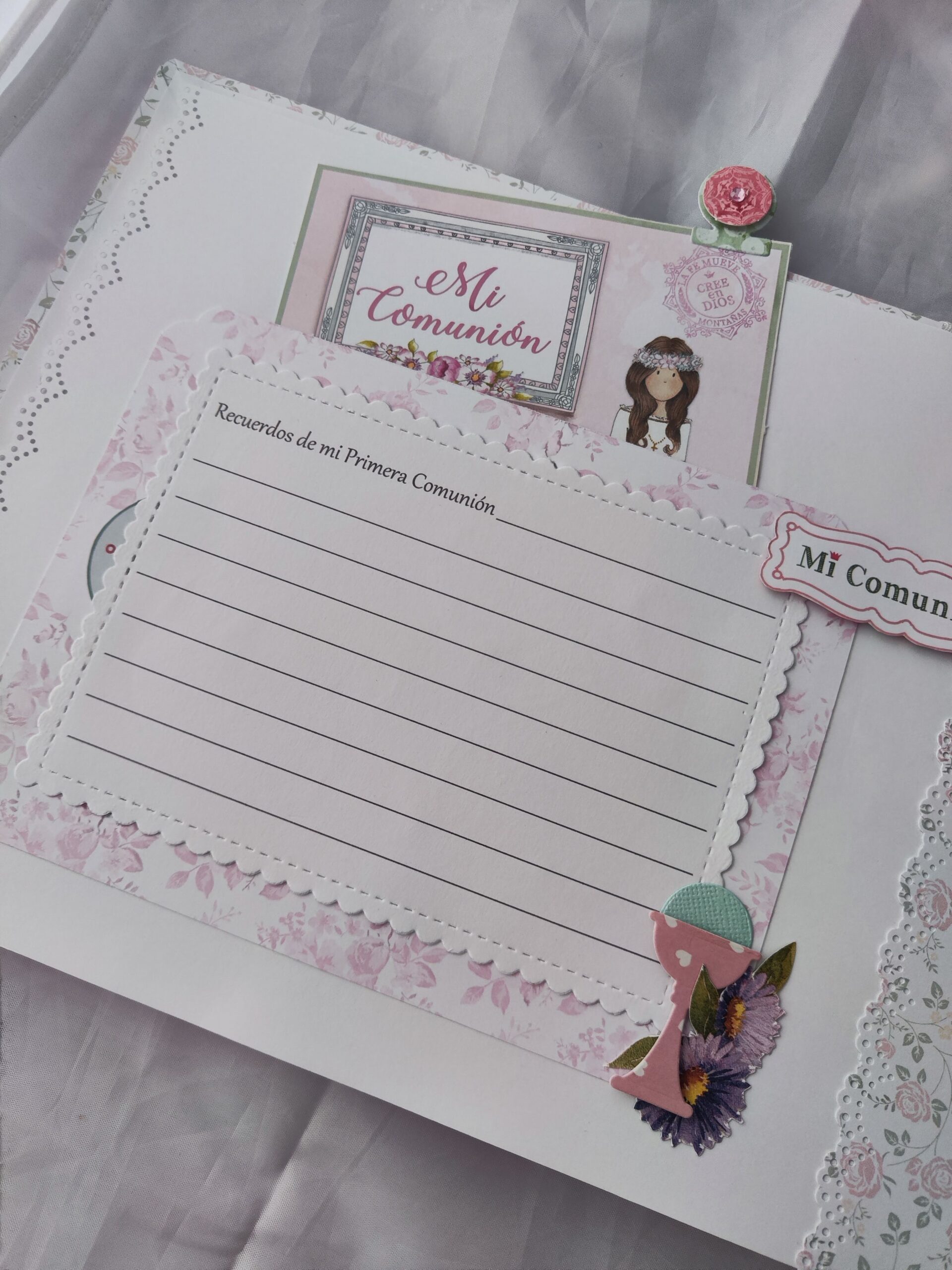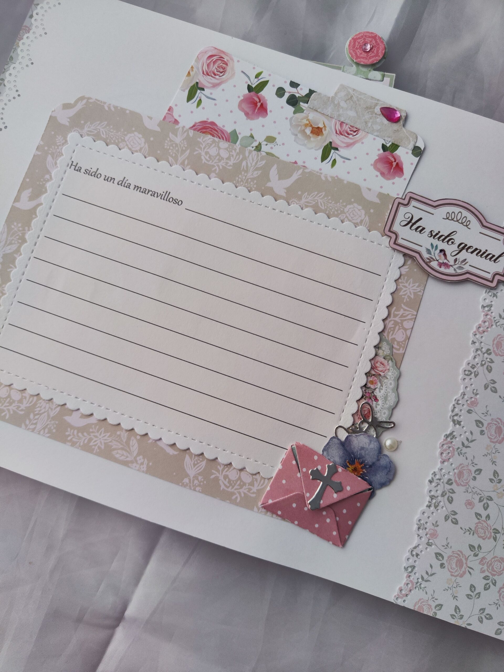 El libro incluye tres láminas decoradas por delante y por detrás, ideales para colocar las fotos más especiales y acompañarlas de palabras llenas de emoción. Además, cuenta con una página dedicada a la dedicatoria, ese espacio íntimo donde familiares o seres queridos pueden dejar un mensaje único.