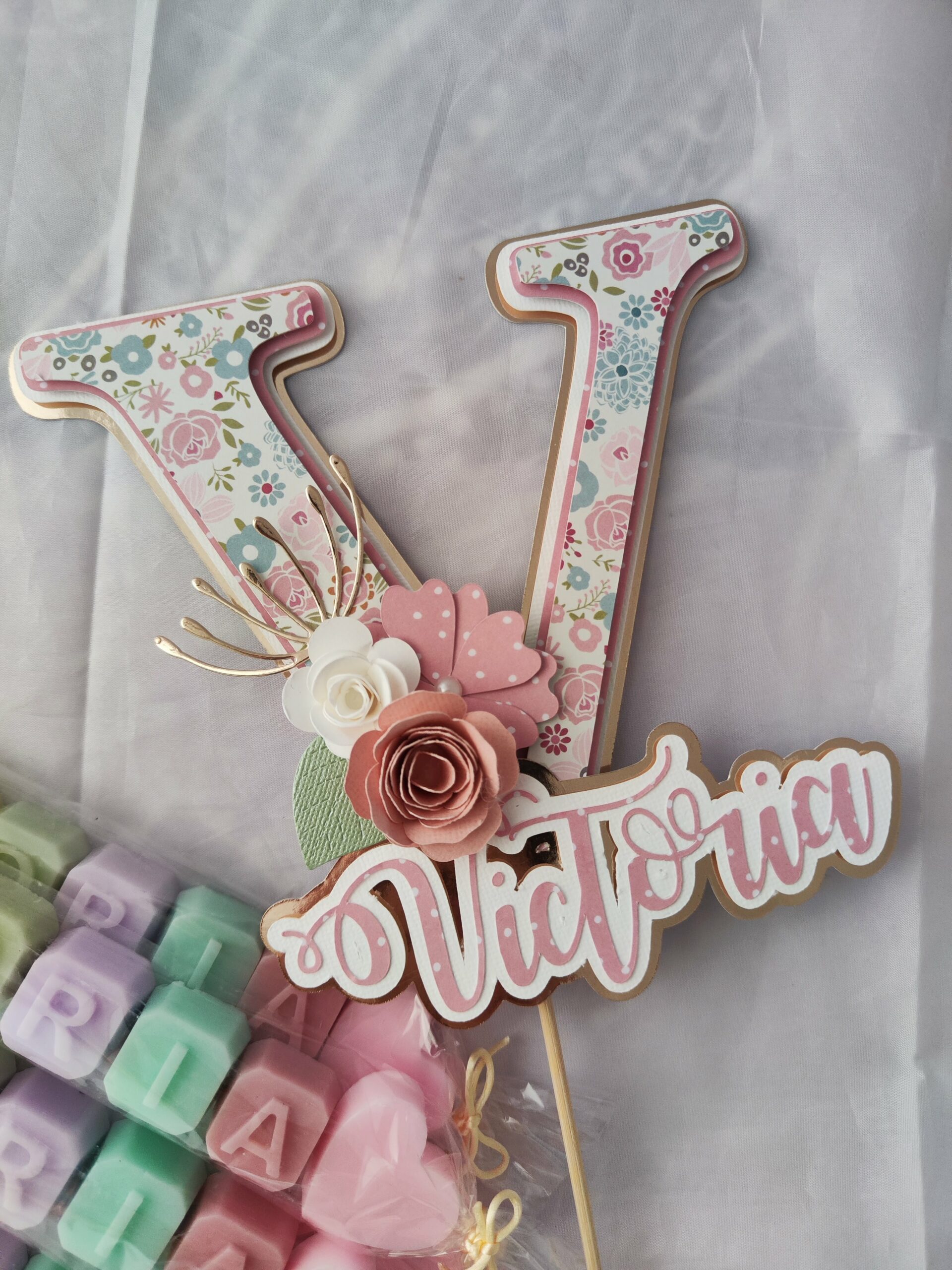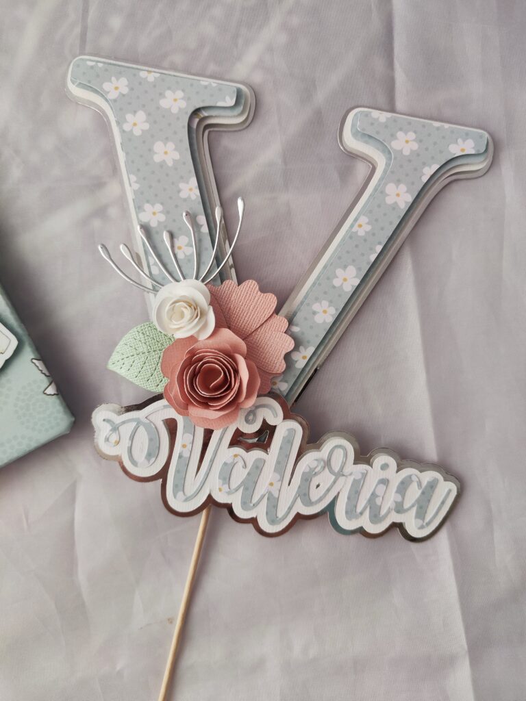 Por último, el conjunto se completa con un caketopper personalizado para el pastel de Comunión, diseñado a juego con el resto de la papelería.