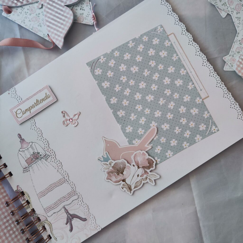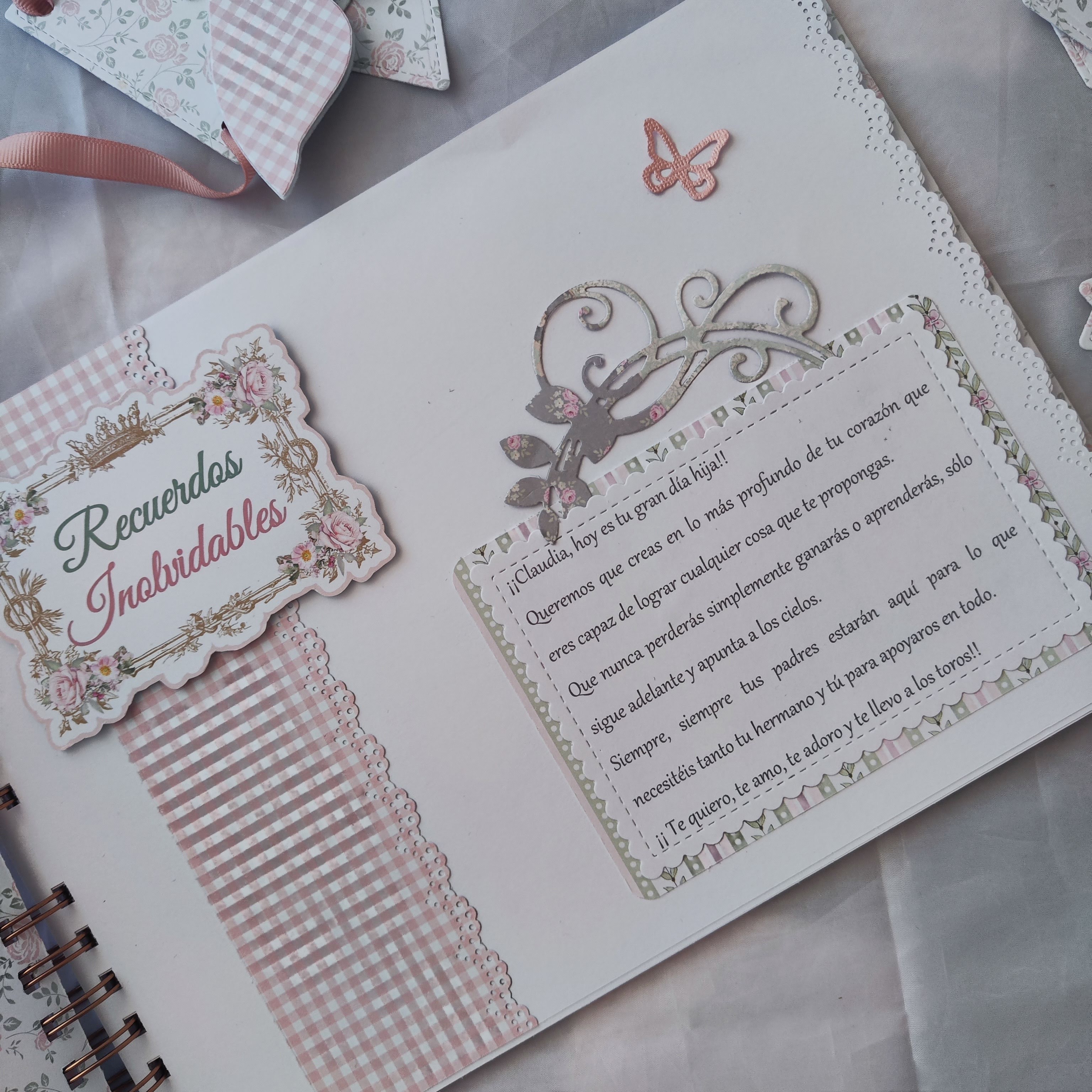 Por dentro, cada página invita a revivir momentos únicos: las firmas, los mensajes familiares y las fotografías que conservan la emoción del día. Asimismo, todo el interior está decorado con los mismos tonos suaves y papeles florales, lo que crea una sensación de continuidad muy agradable.