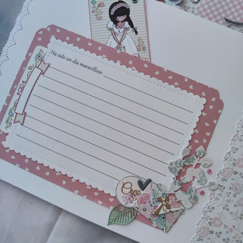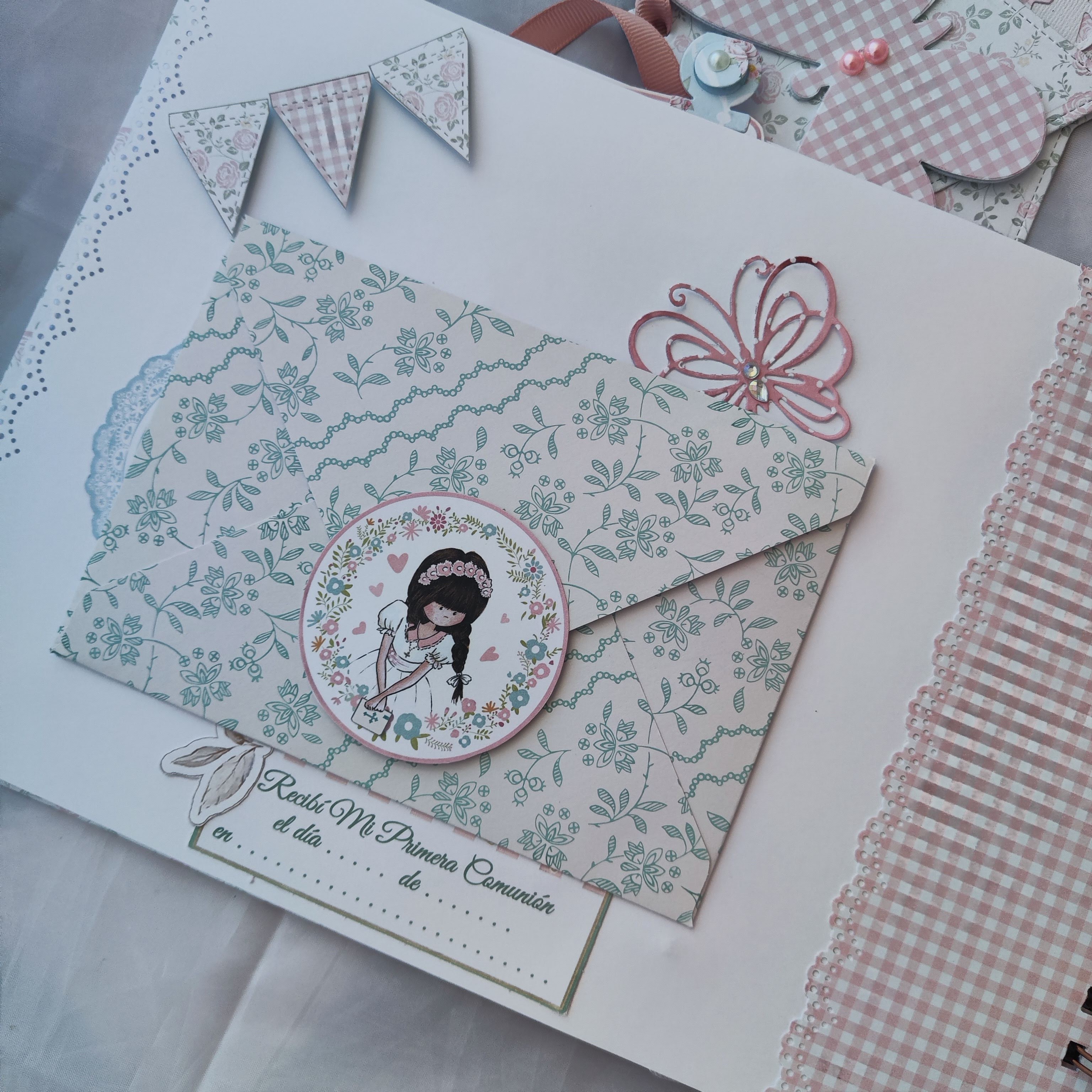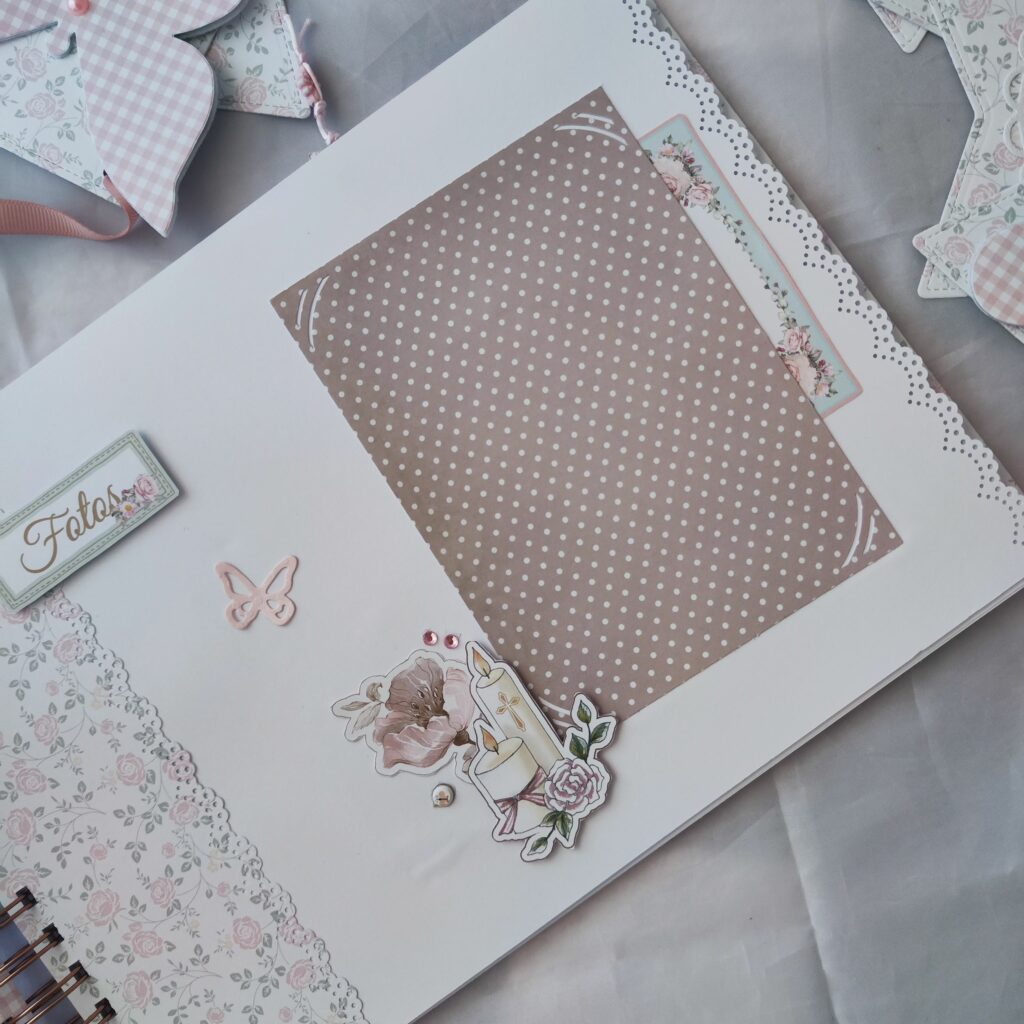 Este libro de comunión personalizado se convirtió en un pequeño tesoro lleno de espacio para guardar recuerdos, fotos y dedicatorias. En la portada, el nombre de Claudia aparece rodeado de troqueles, cintas y una dulce muñequita que la representa en su gran día.