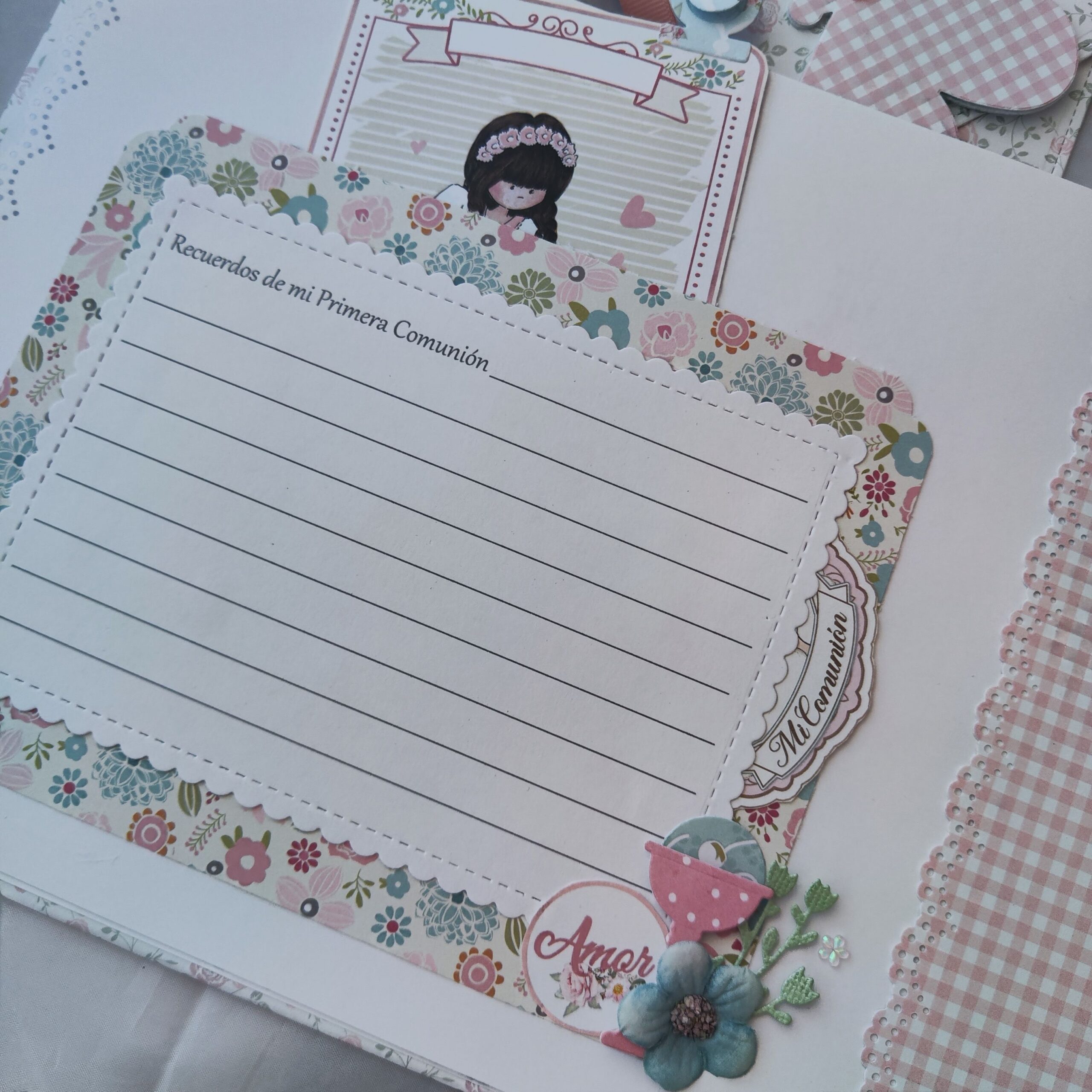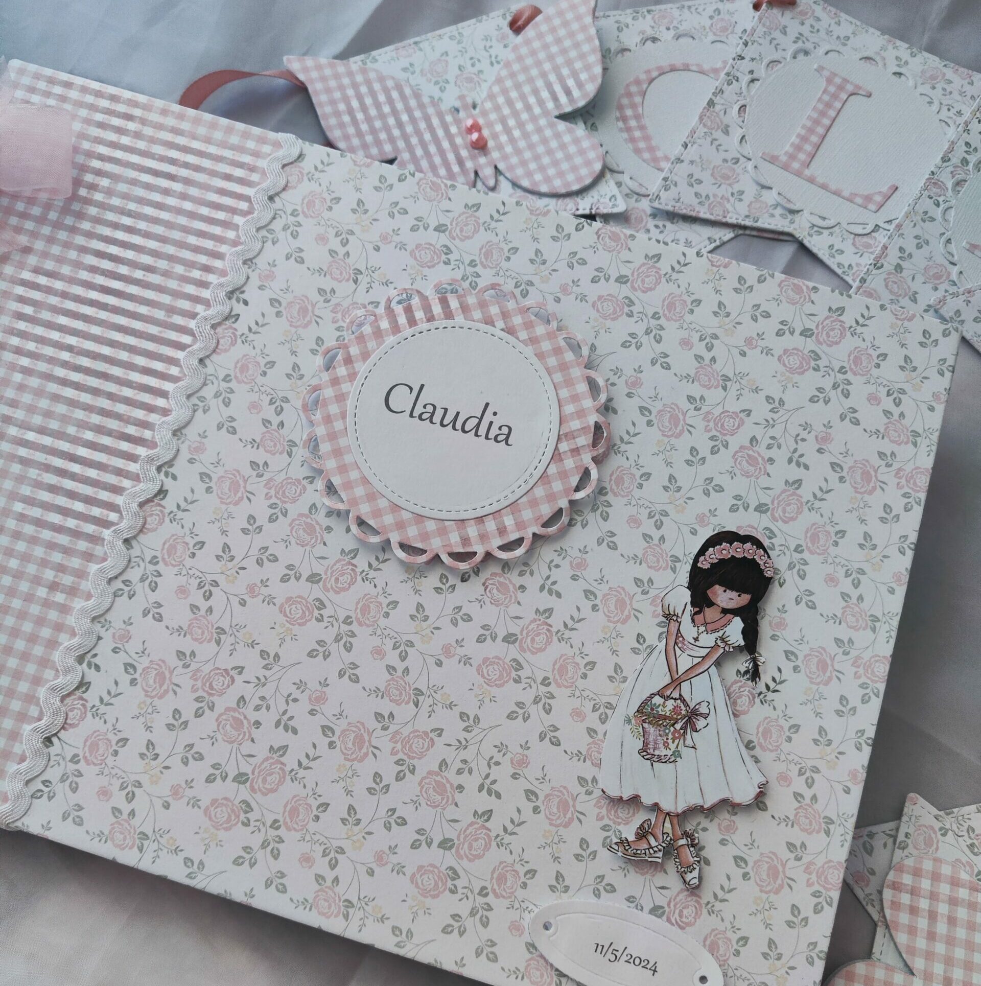 Este libro de comunión personalizado se convirtió en un pequeño tesoro lleno de espacio para guardar recuerdos, fotos y dedicatorias. En la portada, el nombre de Claudia aparece rodeado de troqueles, cintas y una dulce muñequita que la representa en su gran día.