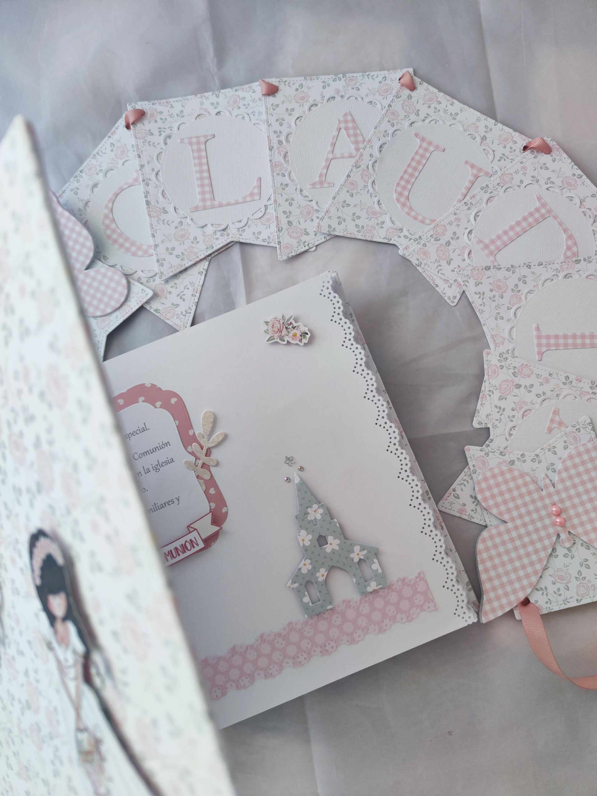 Hoy quiero enseñarte uno de los proyectos más dulces de la temporada pasada: el libro de comunión personalizado de Claudia, acompañado de una guirnalda a conjunto. Fue un encargo muy especial, hecho con mimo y cuidado, pensado para reflejar toda la dulzura de ese día tan importante.
