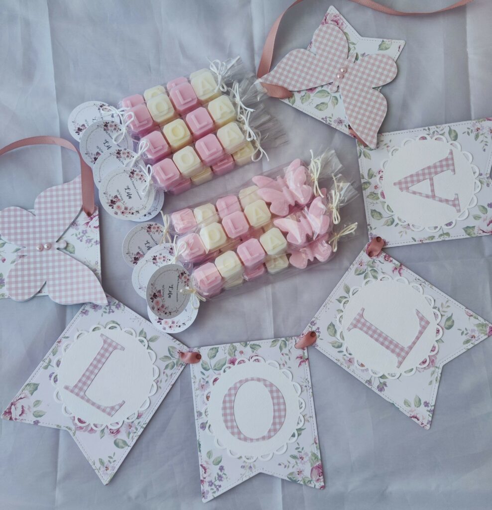 Además, para completar la decoración, también realizamos una guirnalda a conjunto, siguiendo la misma línea floral y los tonos empolvados del libro y los jaboncitos. Cada banderín fue diseñado y montado artesanalmente, cuidando que los estampados, cintas y acabados mantuvieran la coherencia estética del conjunto.