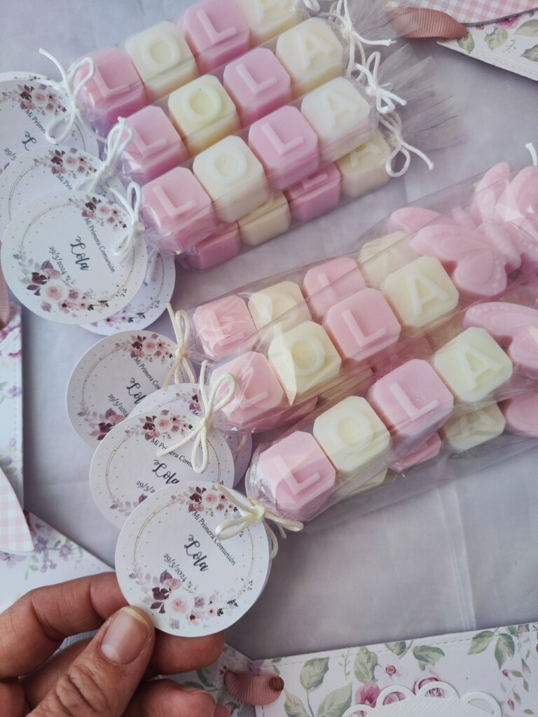 Para completar el conjunto, preparamos unos jaboncitos artesanales envueltos en celofán transparente, combinando tonos rosa y blanco a juego con el libro. Cada pieza mantiene la misma línea estética delicada y cuidada.