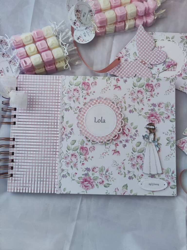 La portada combina estampado floral romántico con vichy en tonos rosados, creando una estética dulce y atemporal. En el centro, una pieza troquelada en capas enmarca el nombre de Lola, aportando volumen y protagonismo. Como detalle especial, incorpora una ilustración de niña de Comunión en relieve que armoniza con toda la composición.
