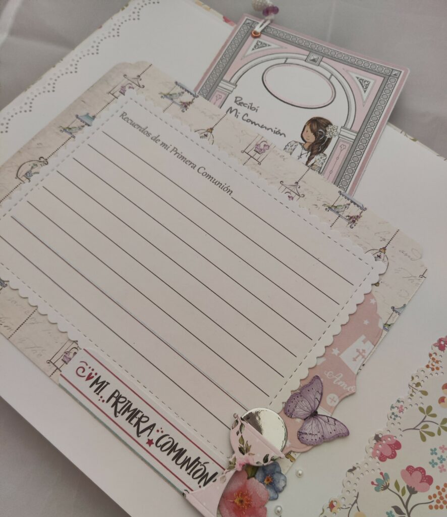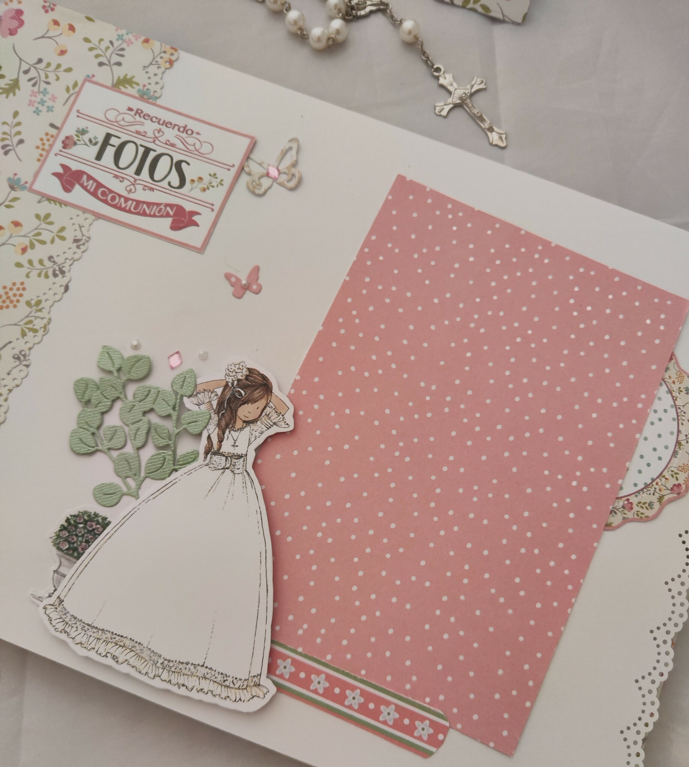 En el centro, añadí una etiqueta circular con el nombre de María, rodeada por un marco troquelado en color azul suave. A un lado, la silueta de una niña con su vestido de comunión, cuidadosamente recortada y colocada en relieve, aporta un toque muy personal.