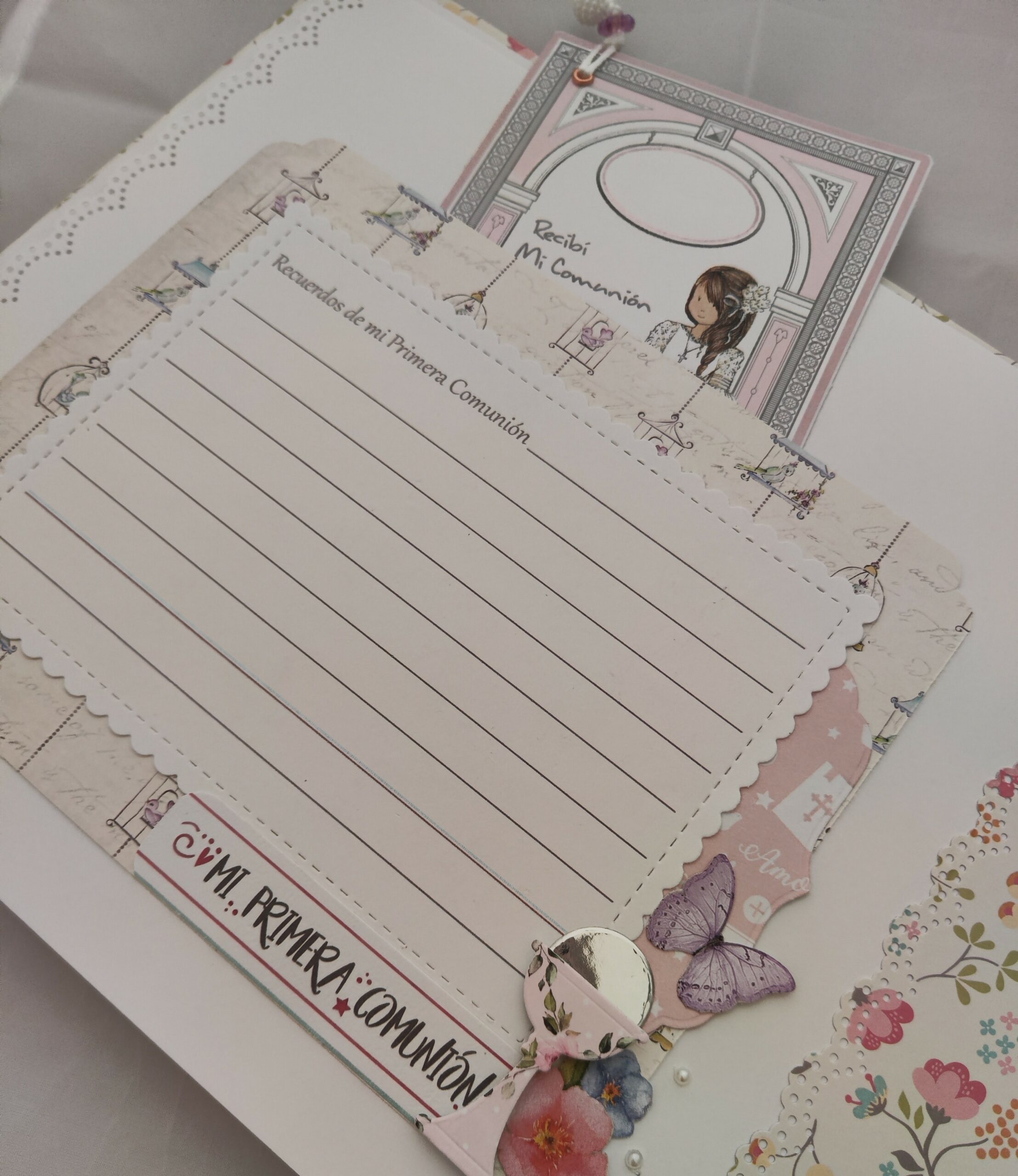 En el interior, cada página está pensada para que la familia pueda atesorar fotografías, dedicatorias y recuerdos de la Primera Comunión.